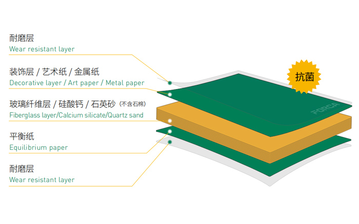 • 福爾卡?醫(yī)耐板?(玻纖復(fù)合不燃板)是由耐磨層、裝飾層、玻璃纖維層、硅酸鈣、石英砂(不含石棉)和平衡紙,表面經(jīng)過三聚氰胺樹脂與特種改性樹脂浸漬層疊后高溫高壓而成,產(chǎn)品的密度不低于1650KG/m3,厚度從4mm 到12mm,形成了整體A級(jí)防火、密度高、硬度高、表面毛孔很小的纖維板。